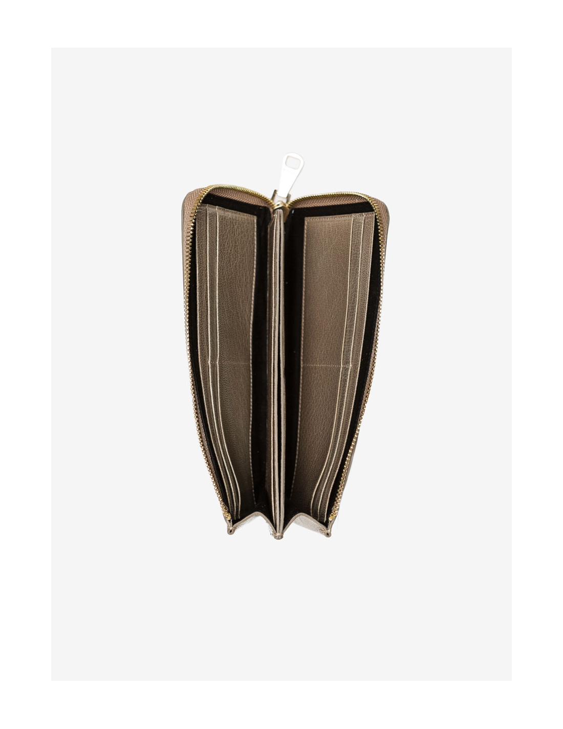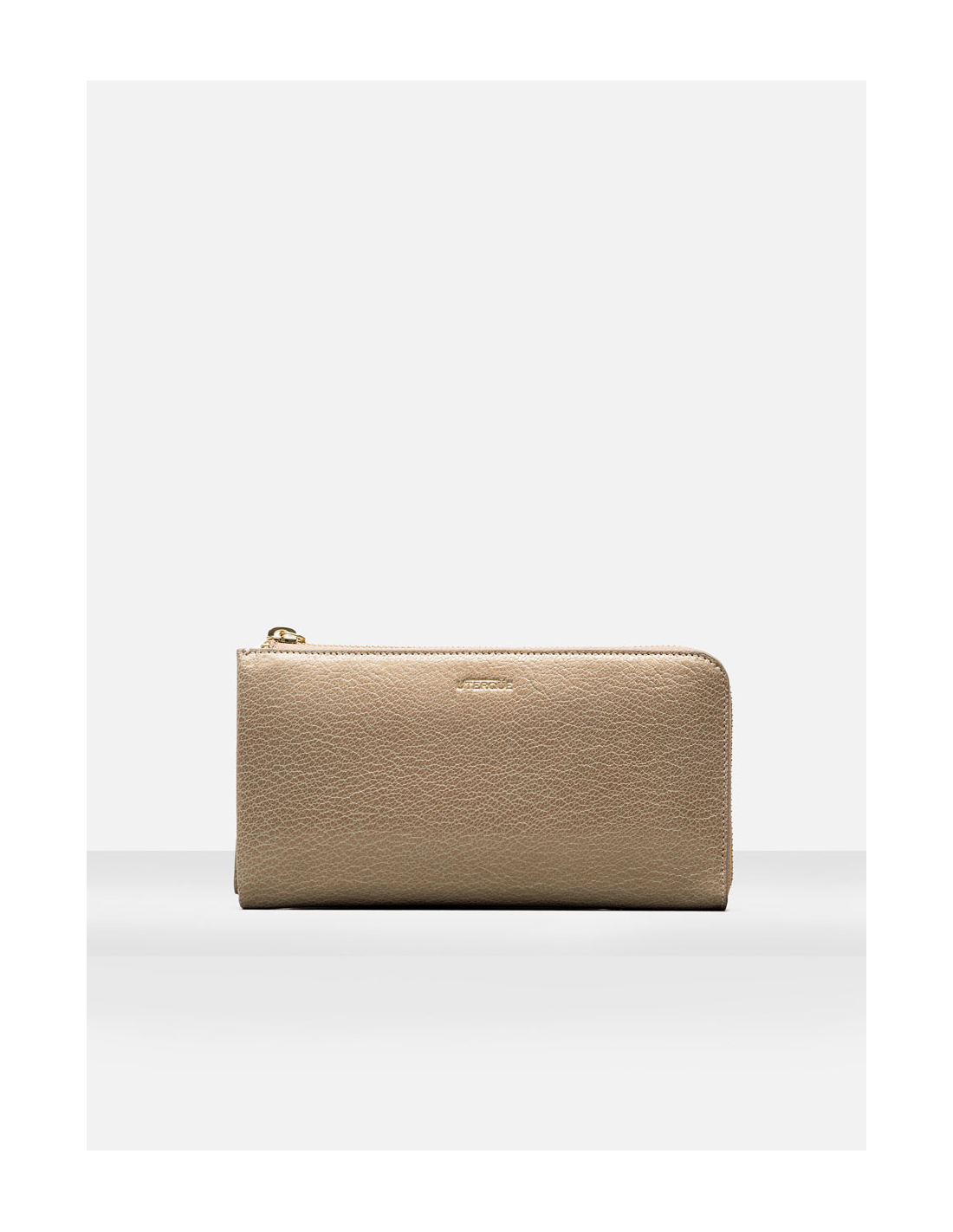 Billetero realizado en España y confeccionado en piel caprina de alta calidad con acabado metalizado. Tiene un único compartimento con cierre cremallera que consta de tres compartimentos en el interior: bolsillo cremallera y espacios para tarjetas. Viene con bolsita guardapolvo.