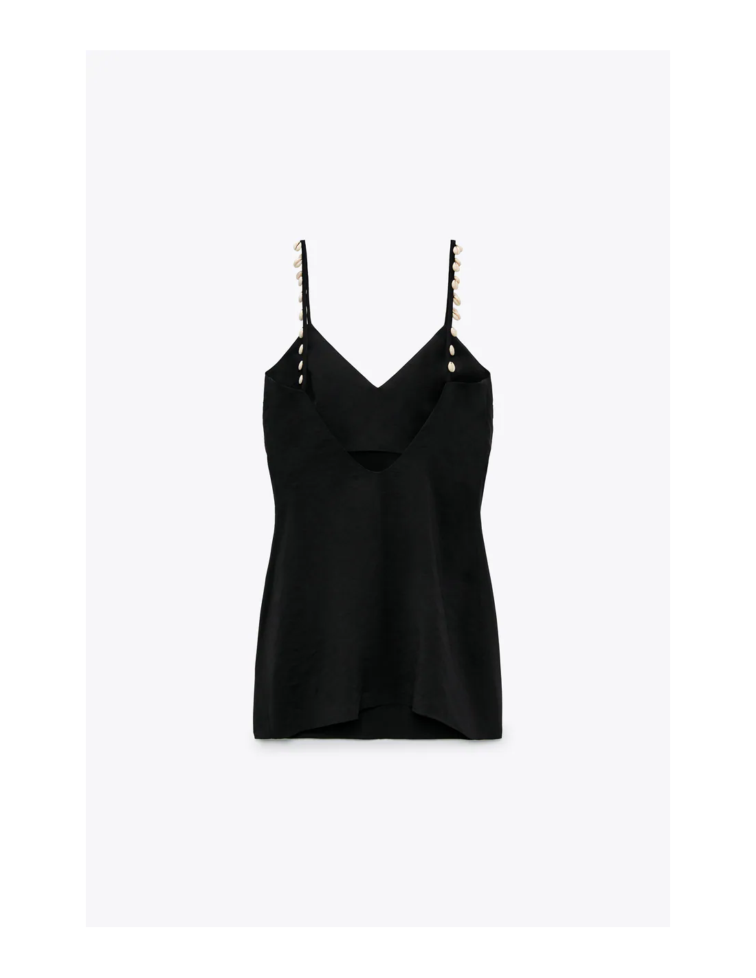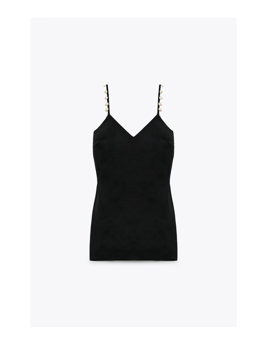 VESTIDO MINI DE ESCOTE PICO Y TIRANTES FINOS CON APLICACIÓN DE CONCHAS. BAJO ACABADO EN EVASÉ.